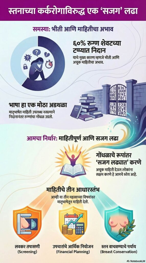 भारतात स्तनाच्या कर्करोगाचे ६०% रुग्ण केवळ भीती आणि माहितीच्या अभावामुळे शेवटच्या टप्प्यात निदान होतात. भाषेचा आणि भीतीचा हा अडथळा दूर करणे हेच आमचे मुख्य ध्येय आहे. लवकर तपासणी (Screening), उपचारांचे आर्थिक नियोजन आणि स्तन वाचवण्याचे पर्याय (Breast Conservation) यांविषयी मातृभाषेतून अचूक माहिती देऊन, कर्करोगाच्या निदानानंतर उडणाऱ्या गोंधळाचे रूपांतर एका ‘सजग आणि माहितीपूर्ण’ लढ्यात करण्याचा आमचा […]
